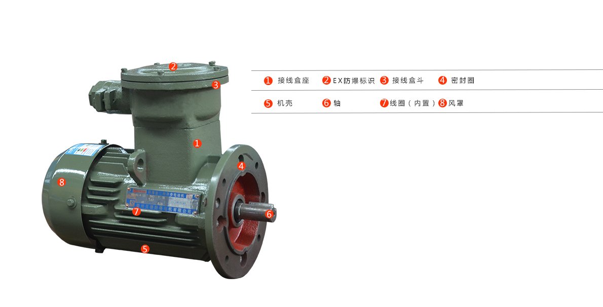 采用垂直水平的平行散熱片結構,接線盒在機座頂部,接線盒的進線方式為橡套電纜,其接線端子分為三個(供一種電壓)或六個(供兩種電壓)兩種結構。